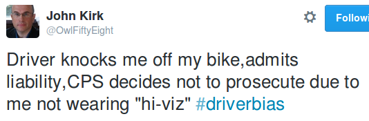 DriverBiasOf course, this specific case hasn’t been tested in court, but the reasoning the CPS have applied is almost certainly that the “failure” of the aggrieved party to wear a high visibility jacket or vest would be sufficient to put reasonable doubt in the minds of magistrates or jurors; sufficient for them to think it is possible that even someone who was driving to the standard expected of a careful and competent driver might still have hit the cyclist. The worrying thing is that the CPS may well be right in that. Jurors do not have expert knowledge of the effectiveness or otherwise of high visibility clothing in preventing collisions with cyclists. Even if the prosecution counsel were to bring expert witnesses to testify in relation to that, the jurors (or magistrates), many of whom might be drivers themselves, might think: “yes, I also might have failed to see a cyclist who hasn’t taken the precaution of making themselves highly visible”.