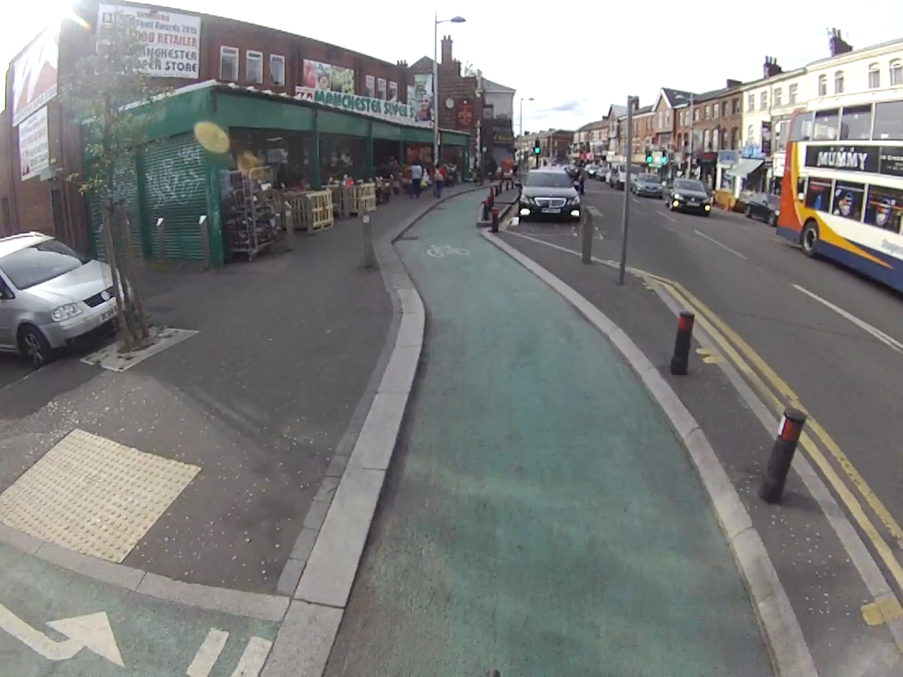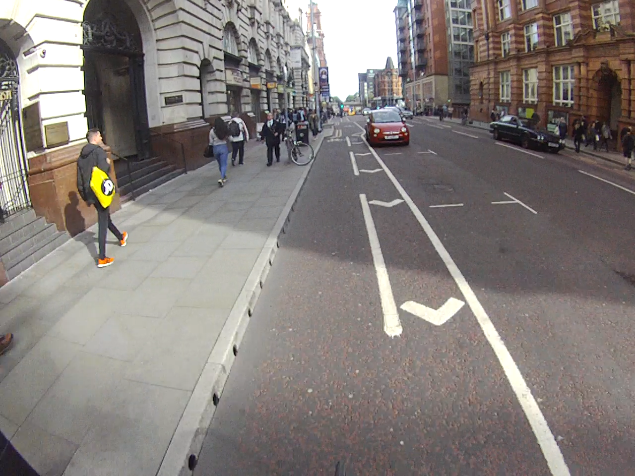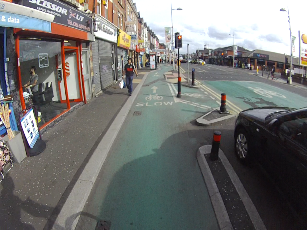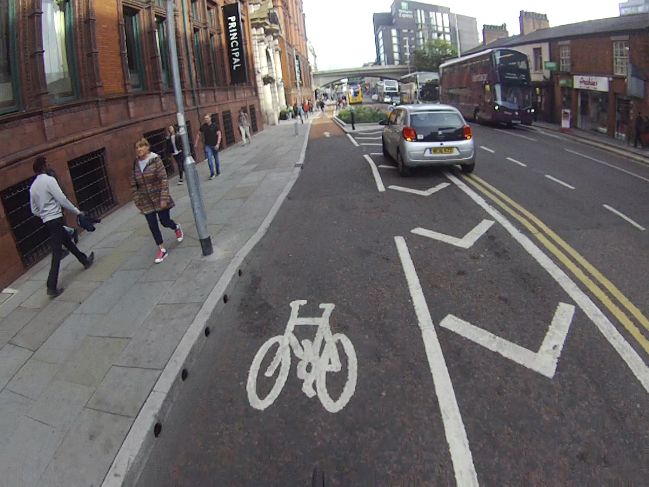 A couple of months ago I was in Manchester so I rode the route to take some photos to upload onto cyclestreets and I found it pretty scary. I was riding slower than you were and wouldn’t have attempted to undertake a left turning car as you did at 3:45. Nevertheless I did have to perform several emergency stops to avoid hazards, mostly other cyclists and pedestrians, but also a couple of turning vehicles. The danger is most serious at priority junctions where you need to check for traffic coming from three directions. This is particularly tricky where you are hidden from other road users behind parked cars. I spend five minutes at the junction of Walmer Street and observed several near misses: