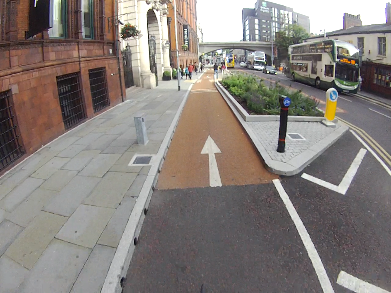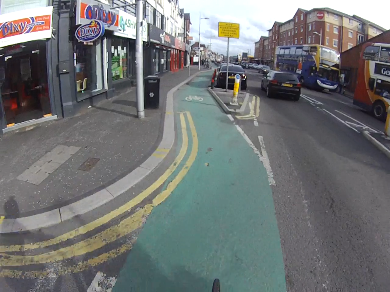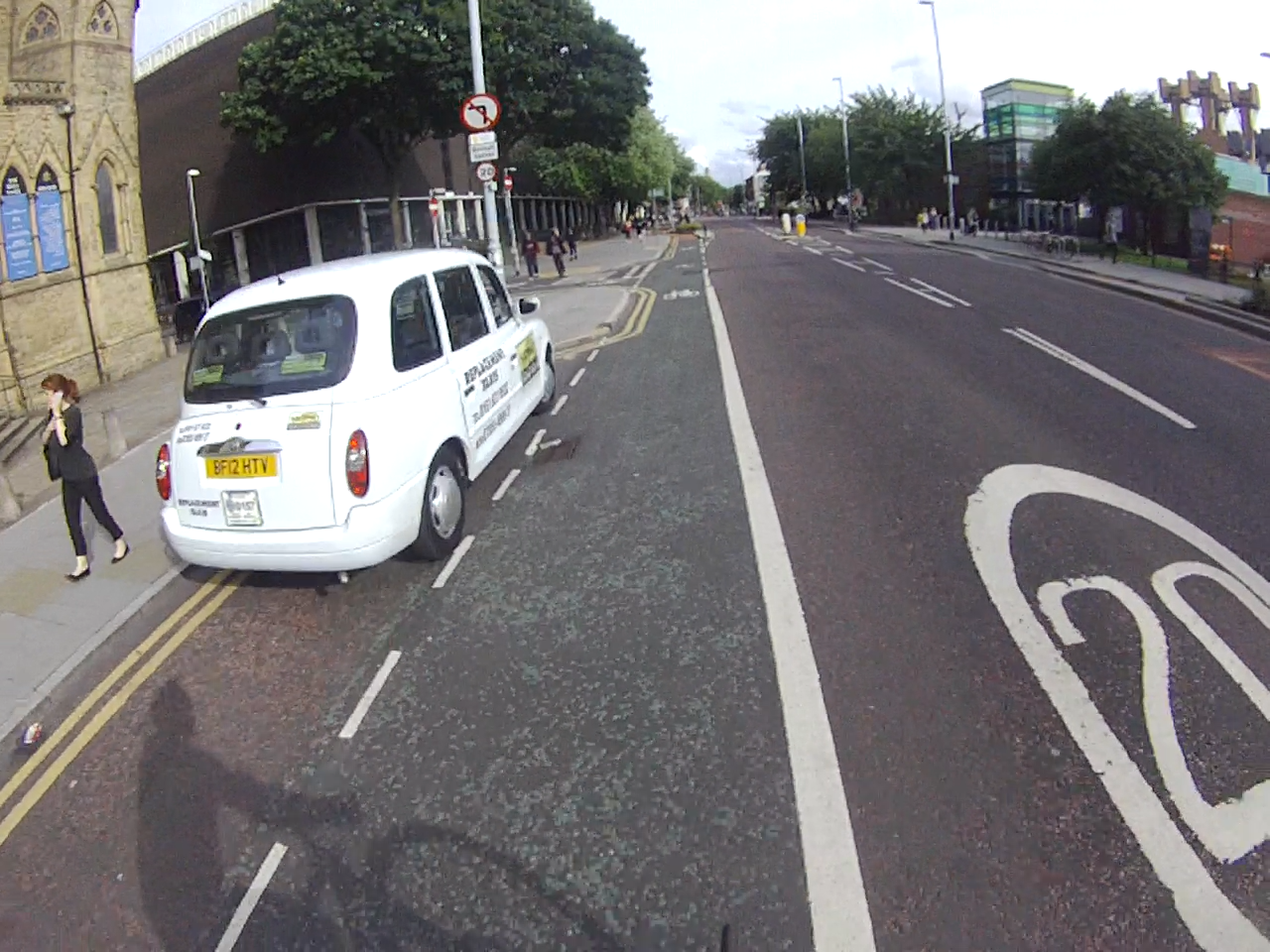 A couple of months ago I was in Manchester so I rode the route to take some photos to upload onto cyclestreets and I found it pretty scary. I was riding slower than you were and wouldn’t have attempted to undertake a left turning car as you did at 3:45. Nevertheless I did have to perform several emergency stops to avoid hazards, mostly other cyclists and pedestrians, but also a couple of turning vehicles. The danger is most serious at priority junctions where you need to check for traffic coming from three directions. This is particularly tricky where you are hidden from other road users behind parked cars. I spend five minutes at the junction of Walmer Street and observed several near misses: