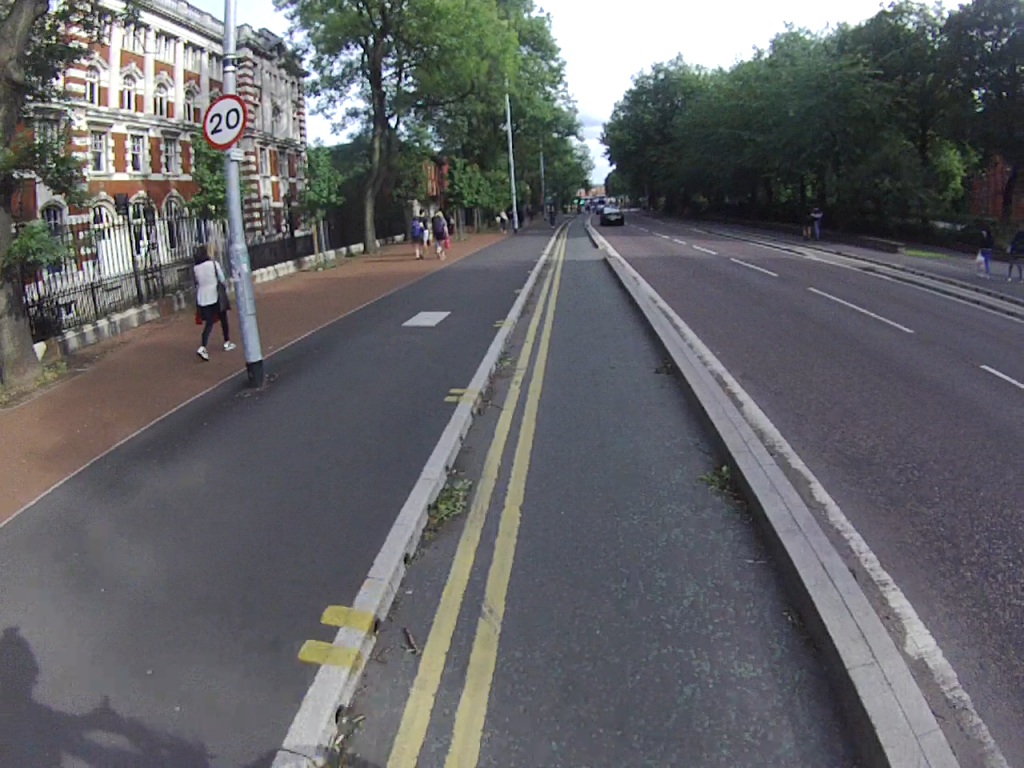 Unfortunately, when you get closer to Fallowfield, there are sections of shared carriageway and junctions, some with narrow painted cycle lanes, with a 30 MPH speed limit.