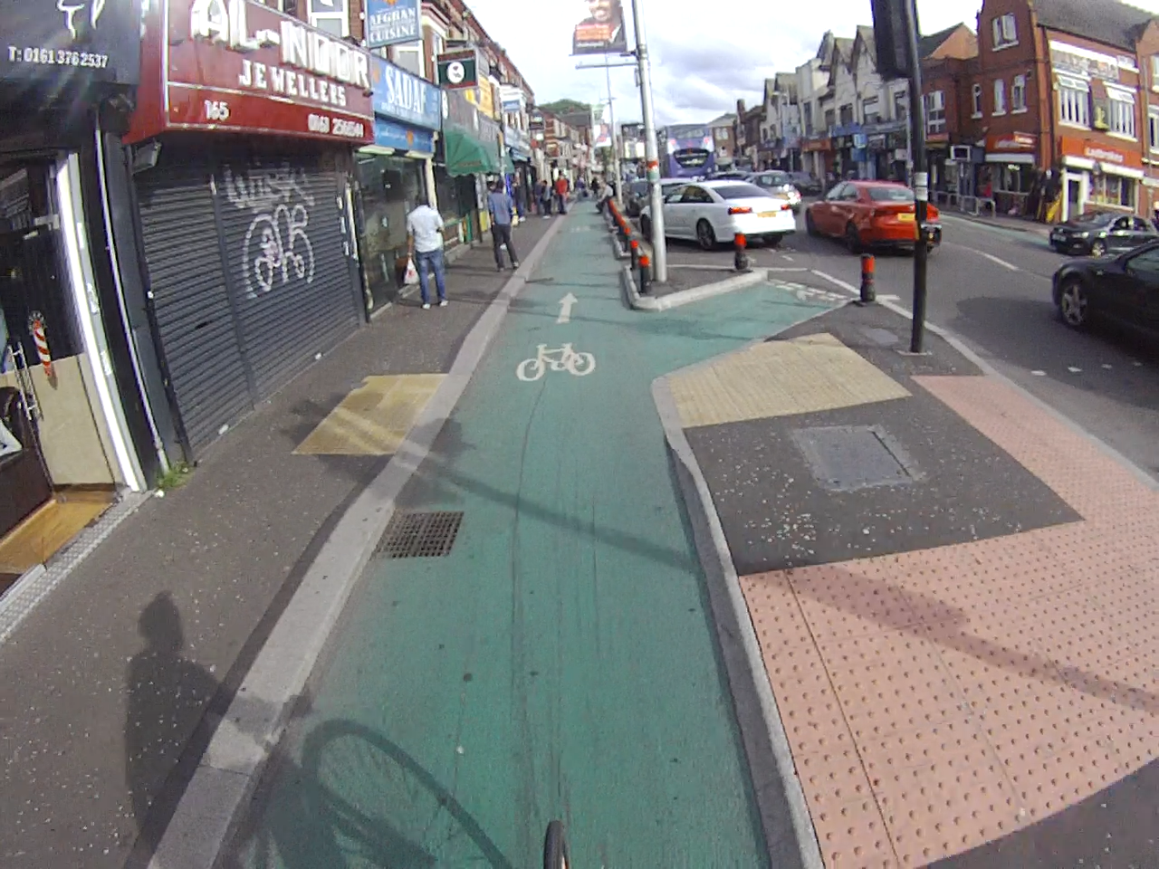 (a) uses quite a bit of what was already there such as the raised cycleways past Owens Park. Unfortunately the bus-stop-bypasses tend to wither out as you go south, and the pavement based section heading north past Platt Fields is a bit of an “optional” dogs dinner – as you say, “horrible”! Quite a few cyclists just use the bus lane still.