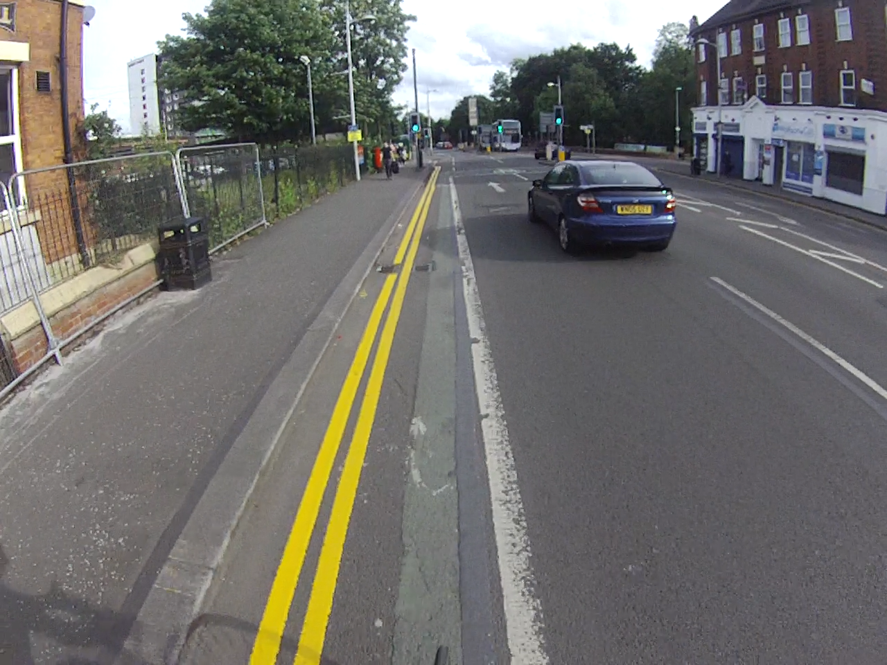 In this image, I am approaching the junction in the protected cycle lane, with the traffic light on red and a car in the main carrageway indicating to turn left, when the traffic light starts to change. By the time I have drawn level with the car, the light has changed to green and the car is starting to pull away.