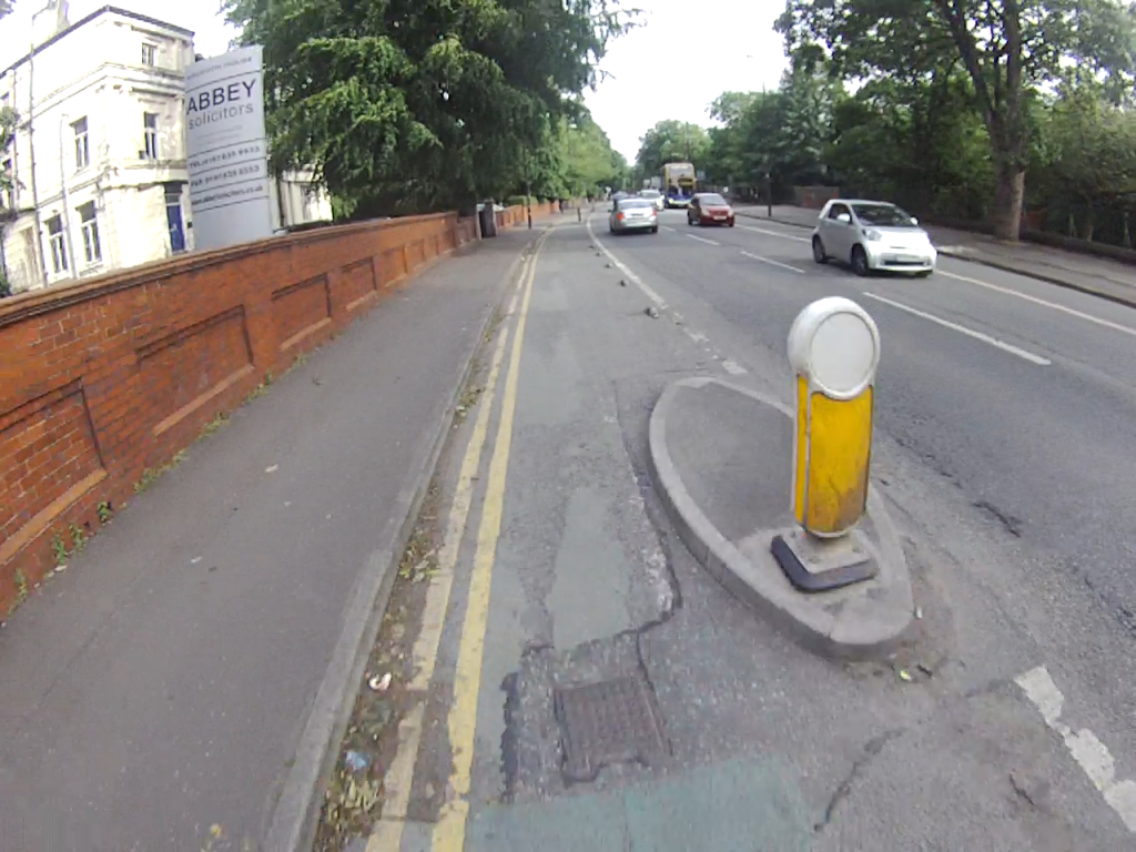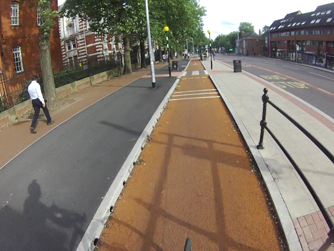 Section (b) – the Curry Mile – is not only narrower than I’d like, but quite winding. Simply put, I feel the political necessity of leaving so much on-street parking in really spoils it. Parking spaces mean the cycleway and pavement are narrower than they could be, and parked cars create a potentially dangerous visual obstruction. Surely better park off the busy main road where there are already several large car-parks. And that disagreement I mentioned? The curry mile junction you highlight is very much my least favourite along that stretch. I’m sure it’s the kind of thing considered good-practice elsewhere – very popular with Dutch-style aficionados – but too many drivers seem to consider the deflection in the cycleway an indication that cyclists should give way. The double-yellow lines across the cycleway don’t help, but it’s often very unclear who should give way. British drivers aren’t used to turning the corner, and then having to stop and give way. You crossed it when it was clear! I would much rather have seen continuous cycleway and footway all the way through, possibly slightly raised, to give a clear indication that drivers need to give way as they turn and cross not only the cycleway but the footway too.