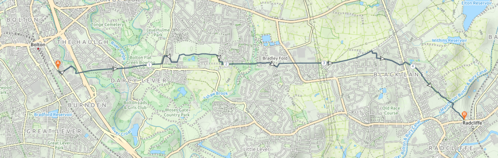 The route is 4.8 miles long, and would probably be just over 5 miles starting from Bolton town centre. I made the following (long) video of the route: