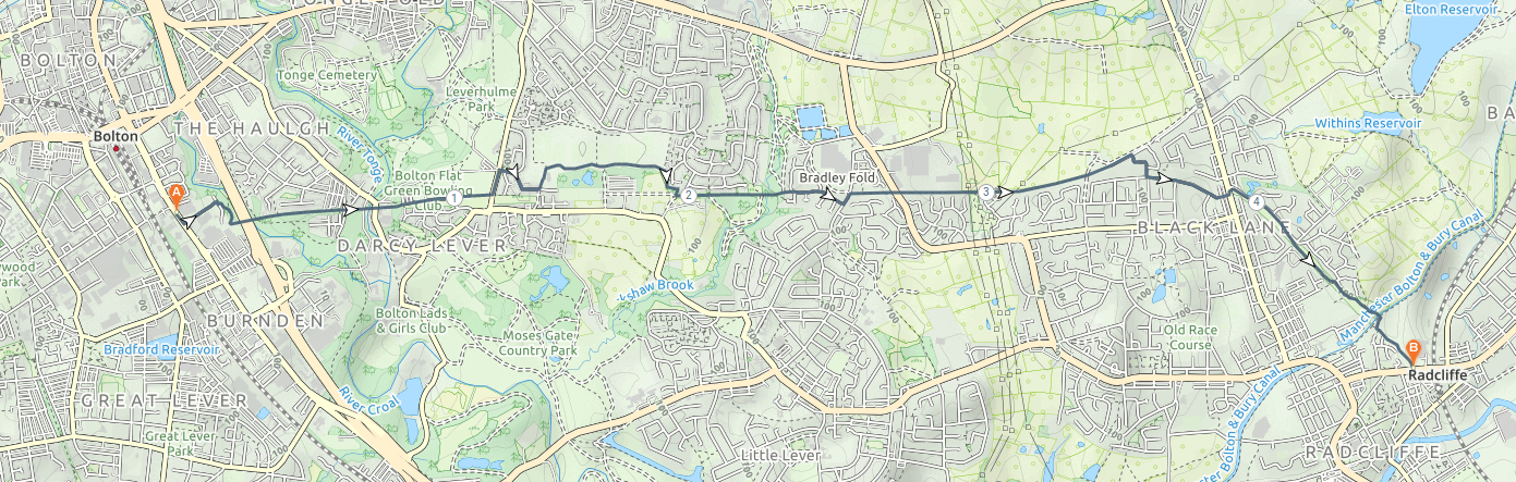 Almost 3 years ago, I posted an article about an off road cycle route from the centre of Bolton to the boundary with Bury at Bradley Fold using a newly created shared path. A couple of days ago I followed an extension of this route to get to the centre of Radcliffe; to the tram station to be precise. This is the whole route from Manchester Road in Bolton to Spring Lane in Radcliffe, opposite the tram station.