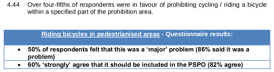 Does it? Well, let’s have a look at the quality of this evidence. A later appendix shows that there were actually just 34 people who claimed to have been “Affected by cycling / skateboarders / scooter users” (See p.34 of the document). Note that is across all three of these activities all put together; there is no specific figure given regarding cycling, which is a separate item from skateboards and scooters in the PSPO: