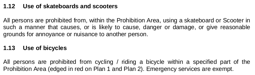 [Edit: the wording on the skating and scooting section was later changed, without consultation and after the PSPO was enacted, so that any use of skateboards or scooters is banned.]