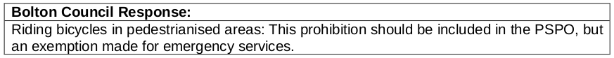 I have been feeling very positive after last night’s meeting of the Bolton Active Travel Forum. I was finally feeling we might be getting some way towards changing the culture of this motor-blighted town. Unfortunately it took less than 24 hours for my bubble to be burst when I looked to see whether anything had happened yet about the consultation on a proposed Public Spaces Protection Order that I responded to back in the summer, which included a proposal to ban cycling across all pedestrianized areas in the town centre. The result of my search was this report, which is to go to the Executive Cabinet Member for Environmental Services on Monday. The report is requesting that the member approve the proposed PSPO without any change regarding the cycle ban aspect.