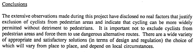 It is not difficult to find real scientific evidence regarding the sharing of pedestrian spaces with cyclists, and the most relevant one I could find is this study conducted by the Transport Research Labs in 1993. This research was based on lengthy actual video footage of cyclists and pedestrians interacting in some of the busiest shared spaces in the country, augmented with similar evidence from various locations in other European countries with high rates of cycling. The video evidence was supplemented by interviews with cyclists and pedestrians (not questionnaire responses from a small number of self-selecting individuals who have been prompted by a leading question). You can read the paper for yourself, but the key point is this conclusion: