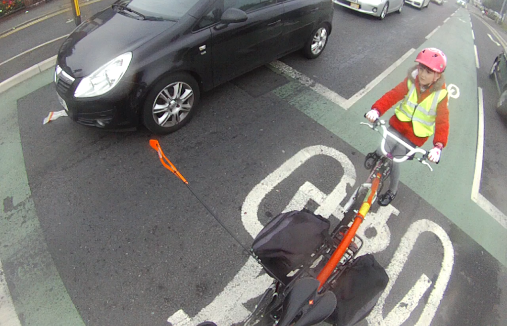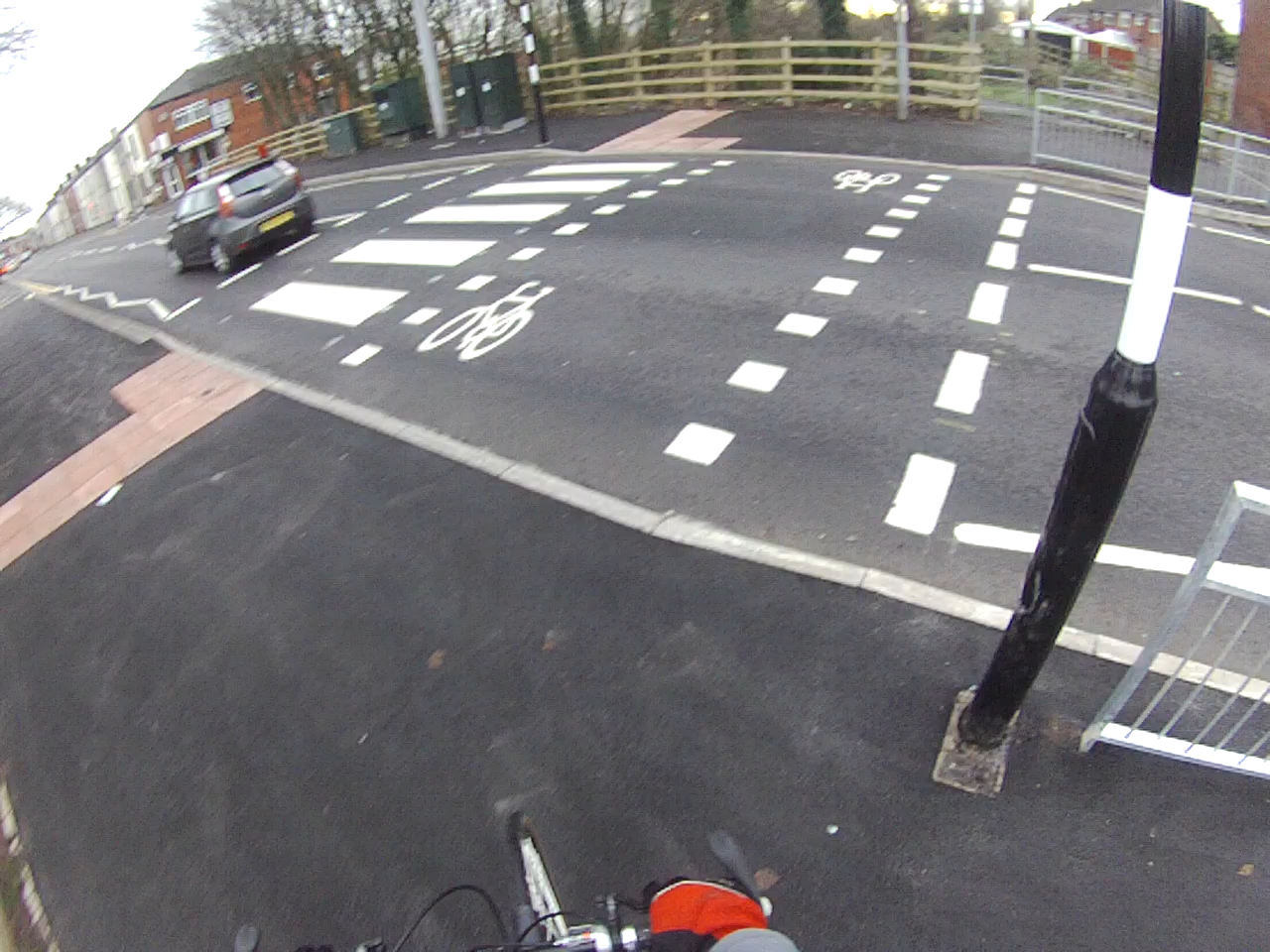 By placing my front wheel onto the crossing, I was able to stop the traffic and proceed across the road. This crossing is on Plodder Lane.