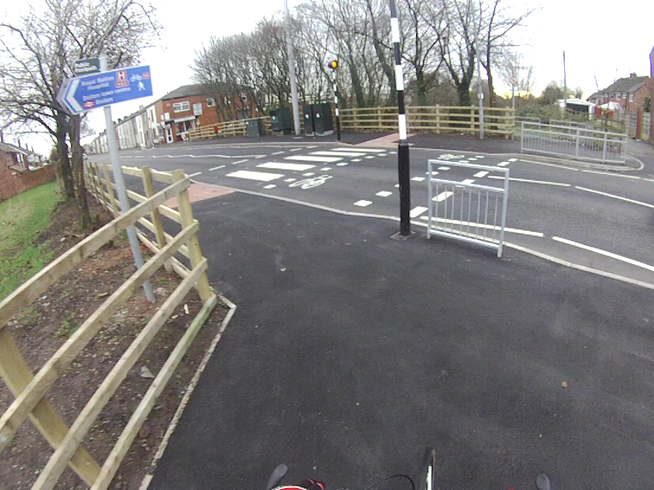 This crossing is not nearly as good as the one on Plodder Lane, but the ramp is a huge improvement over the gulley at the side of the steps that was previously the only way to get cycles up and down. It’s a shame that the path could not continue under the bridge that existed previously as part of the dismantled railway line, but that ship sailed many years ago when it was filled in an then built upon.