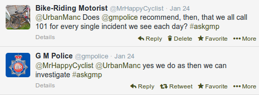 I said earlier that this has been a particularly bad week for encounters with bad drivers. Sometimes I can go a month or more without anything worth posting on YouTube, which is great, then, like the proverbial buses, a whole bunch of them come at once. In the case of this week, however, it followed hot on the heels of a Twitter discussion with cyclists organized by GM Police on the 24th of January under the hashtag: #askgmp. During that discussion, I had the following exchange with the officers responding through the  @GMPolice twitter account: