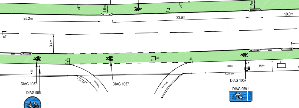 CycleSymbolsAs often happens, the cycle lane, inadequate as it is, disappears on the approach to the junction, so bicycles are supposed to share the same traffic lane with motor vehicles. From a Vehicular Cycling point of view, this is actually sensible as any experienced, properly trained regular cyclist will ride in the centre of the lane in this situation. I’m not saying that this is a sensible design option, because it isn’t; I’m just saying that, in the absence of separation, it is best to share the road as an equal. Unfortunately, the idiot (for idiot they must be) who designed this has placed bicycle symbols in exactly the place where a cyclist should not be: on the inside of a left turn lane approaching a junction. I find it hard to believe that someone who is supposed to know what they are doing has actually, deliberately placed these on the drawing in that position! Again, any cyclist who correctly rides in the centre of the lane will find themselves subjected to road rage and aggression on a regular basis.